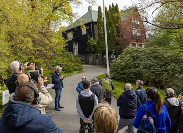 Our first group of fans exploring ABBA's Stockholm: here we are outside ABBA manager Stig Anderson's former home.